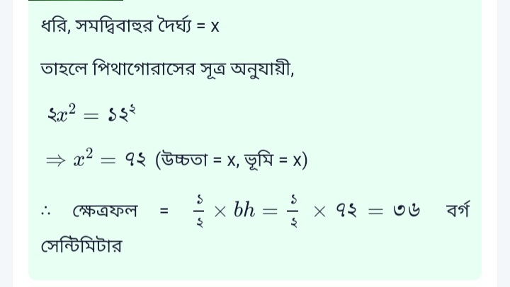 একটি সমদ্বিবাহু সমকোণী ত্রিভুজের অতিভুজের দৈর্ঘ্য ১২ সেমি হলে ত্রিভুজটির ক্ষেত্রফল কত বর্গ সেমি?