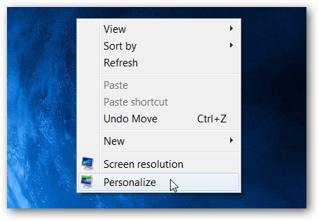 Windows 7 actually makes it fairly easy to change the colors of the window borders, start menu, and the taskbar… and while that’s not exactly what we’re talking about, we’ll quickly show the beginners how to do it. Right-click on the background and choose Personalize from the menu.
